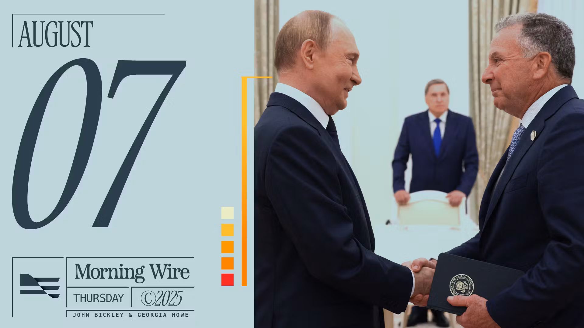 A U.S. envoy’s meeting with Vladimir Putin yields “great progress” on peace talks just before President Trump’s deadline, as the U.S. hikes tariffs on India for buying Russian oil. President Trump is set to sign an executive order targeting “de-banking” to protect Americans from being denied financial services based on their political or religious beliefs. ...